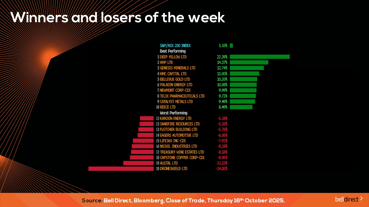 The winning stocks were led by Deep Yellow (ASX:DYL) soaring 22.39%, while AMP (ASX:AMP) added 14.37% and Genesis Minerals ended the week up 12.74%.