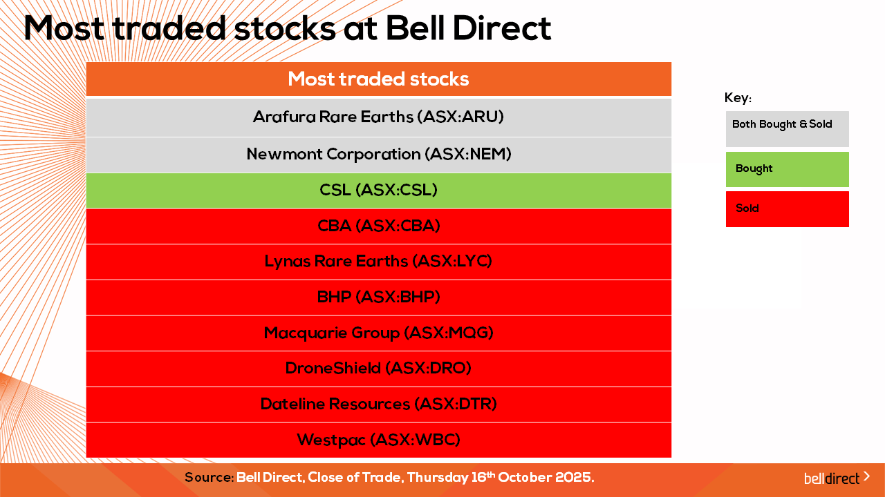 The most traded stocks by Bell Direct clients this trading week were Arafura Rare Earths (ASX:ARU), and Newmont Corporation (ASX:NEM). Clients also bought into CSL (ASX:CSL) while taking profits from CBA (ASX:CBA), Lynas Rare Earths (ASX:LYC), BHP (ASX:BHP), Macquarie Group (ASX:MQG), DroneShield (ASX:DRO), Dateline Resources (ASX:DTR) and ANZ (ASX:ANZ).