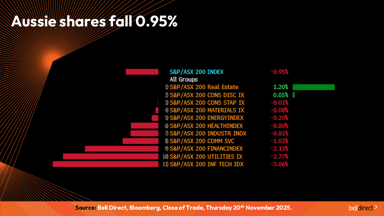 The drop was driven by mounting concerns over lofty technology valuations and a general global “risk-off” mood ahead of key US earnings. Rate- sensitive sectors, especially Financials, led the slump, hitting a six- month low on margin pressure, alongside a sharp derating in Technology stocks. However, the mood shifted following a blowout earnings report from US chip giant Nvidia. The results eased global fears of an impending AI bubble pop and sparked a major relief rally, with the local tech sector soaring and the ASX200 bounding back significantly from its low.