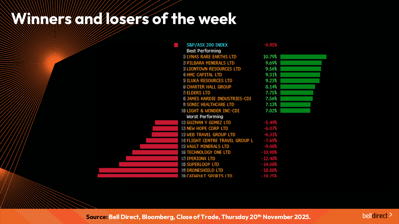 On the ASX200 leaderboard, the top performing stocks were Lynas Rare Earths (ASX:LYC), Pilbara Minerals (ASX:PLS) and Liontown Resources (ASX:LTR) all making impressive gains. Lynas Rare Earths advanced off the back of news this week of global demand for rare earths outside of China. Meanwhile, uranium stocks were higher after the US Department of Energy announced a US$1 billion loan to restart the Three Mile Island nuclear power plant, supported by President Trump to fuel AU data centre growth. This advanced the share price of Paladin Energy this week, as well as other uranium stocks. And Liontown Resources was boosted by the a 2-day gain in the gold price this week.