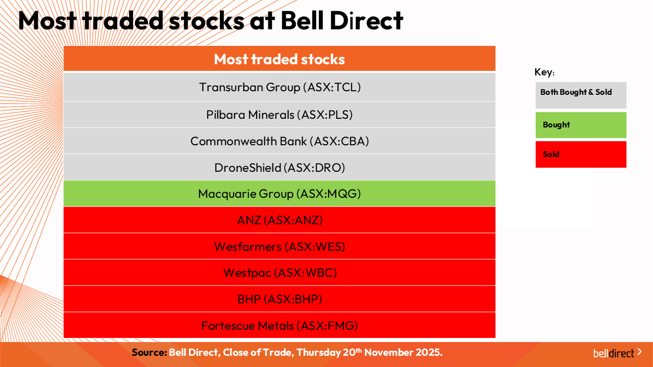 As for the most traded stocks by Bell Direct clients, these were Transurban Group (ASX:TCL), Pilbara Minerals (ASX:PLS), Commonwealth Bank (ASX:CBA) and Droneshield (ASX:DRO). Clients also bought into Macquarie Group (ASX:MQG), while took profits from ANZ Bank (ASX:ANZ), Wesfarmers (ASX:WES), Westpac (ASX:WBC), BHP Group (ASX:BHP) and Fortescue Metals (ASX:FMG).