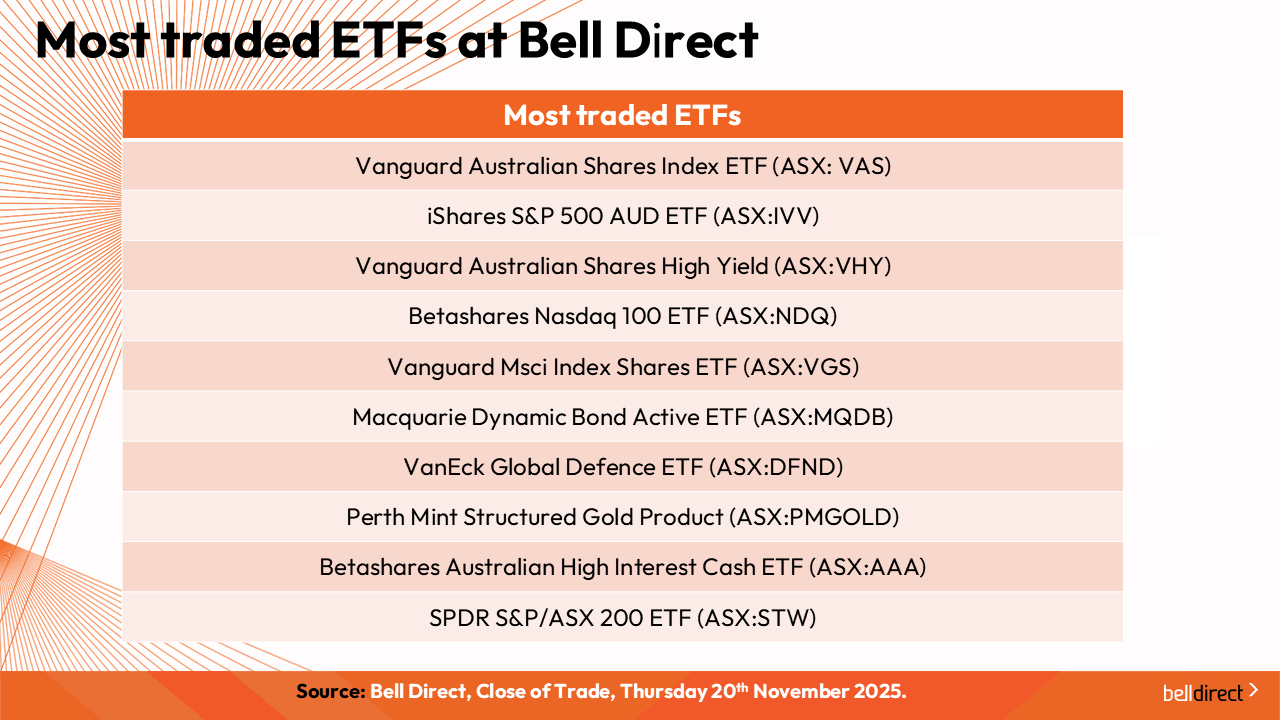 And the most traded ETFs by Bell Direct clients were the Vanguard Australian Shares ETF (ASX:VAS), the iShares S&P500 ETF (ASX:IVV) and the Vanguard Australian Shares High Yield ETF (ASX:VHY).