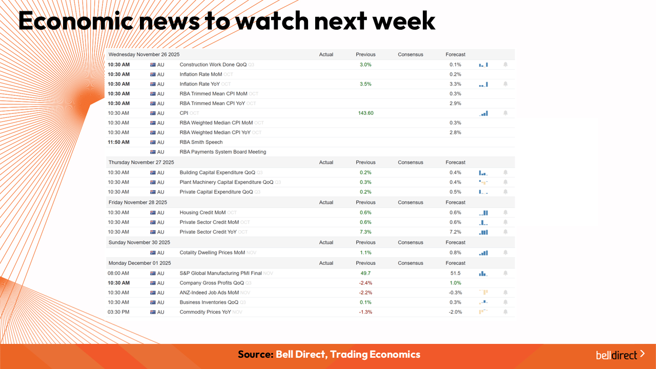 While global tech drove the market’s swings, domestic economic data provide some reassurance this week regarding the labour market’s trajectory. The September quarter Wage Cost Index report suggested the labour market is not overly tight. The report showed overall wages rose by 3.4% over the year, while the private sector saw slightly softer annual growth at 3.2%. this easing aligns with the recent modest rise in the unemployment rate, from 3.7% to 4.3% since late 2023, confirming the classic Phillips curve correlation in Australia. Analysts suggest this 3.2% private sector wage growth should be consistent with underlying inflation hitting the RBA’s 2.5% target mid-point over the long run.